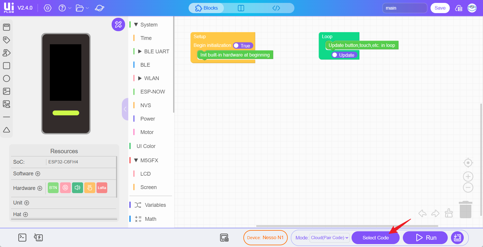 On the Arduino Nesso N1 device, press the middle Button to view the currently generated valid Pair Code in the Pair Code instructions section of the Cloud UI interface.