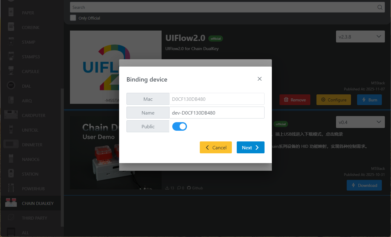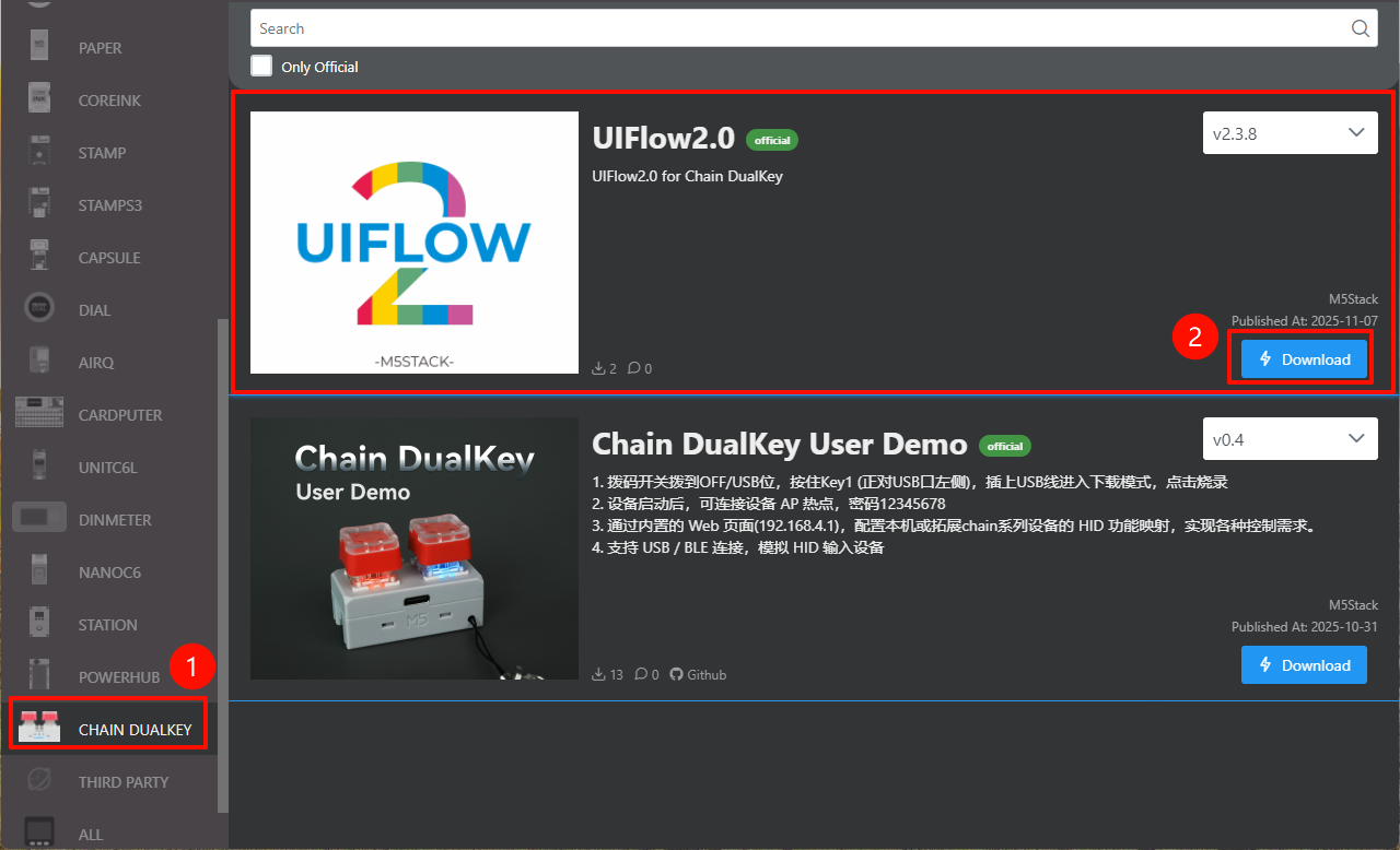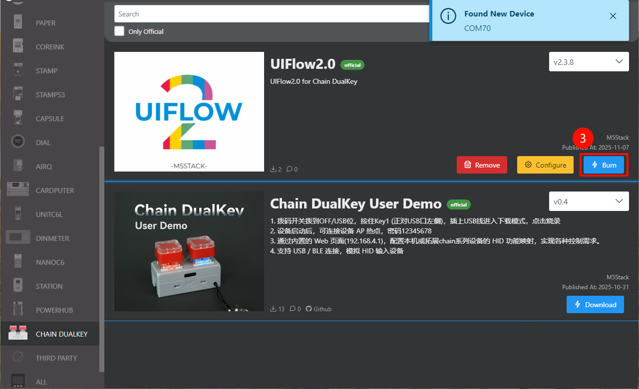 In M5Burner, download the firmware that matches Chain DualKey, as shown below.