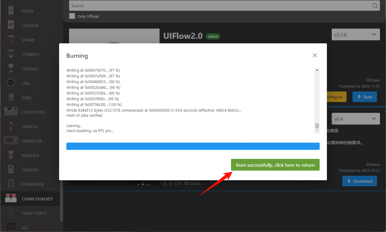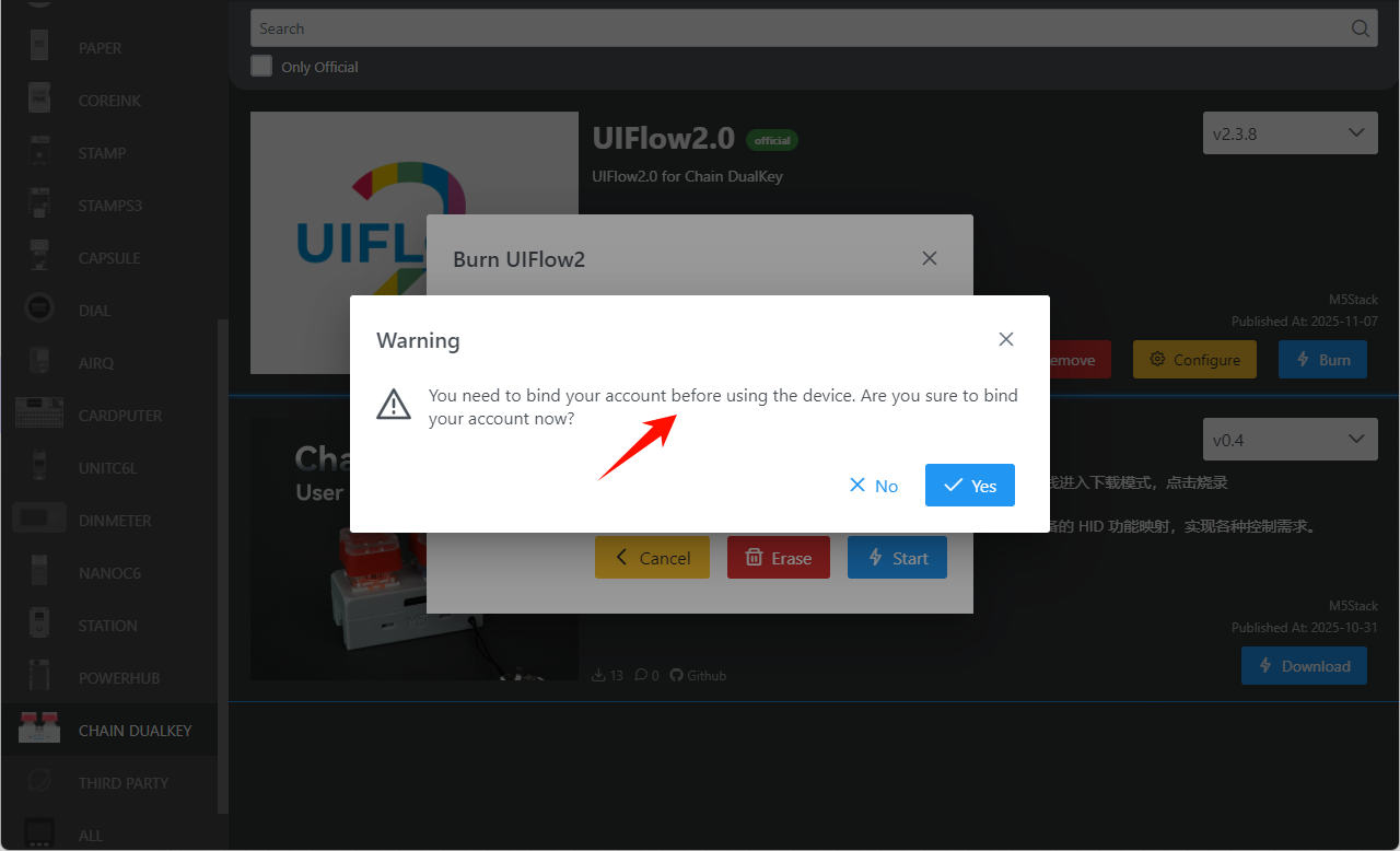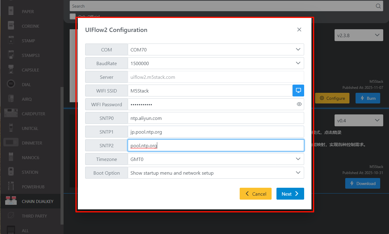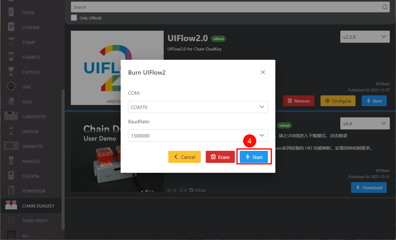 In M5Burner, download the firmware that matches Chain DualKey, as shown below.