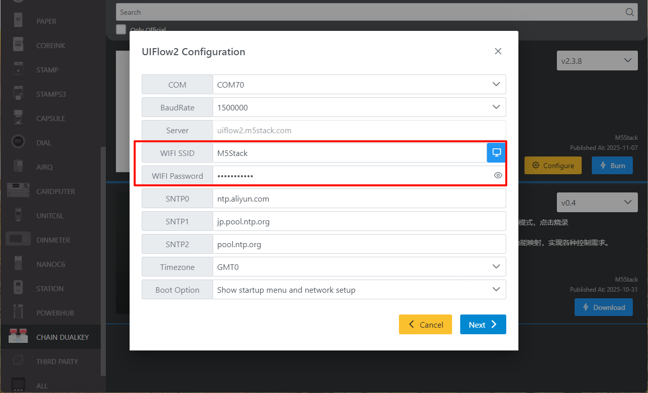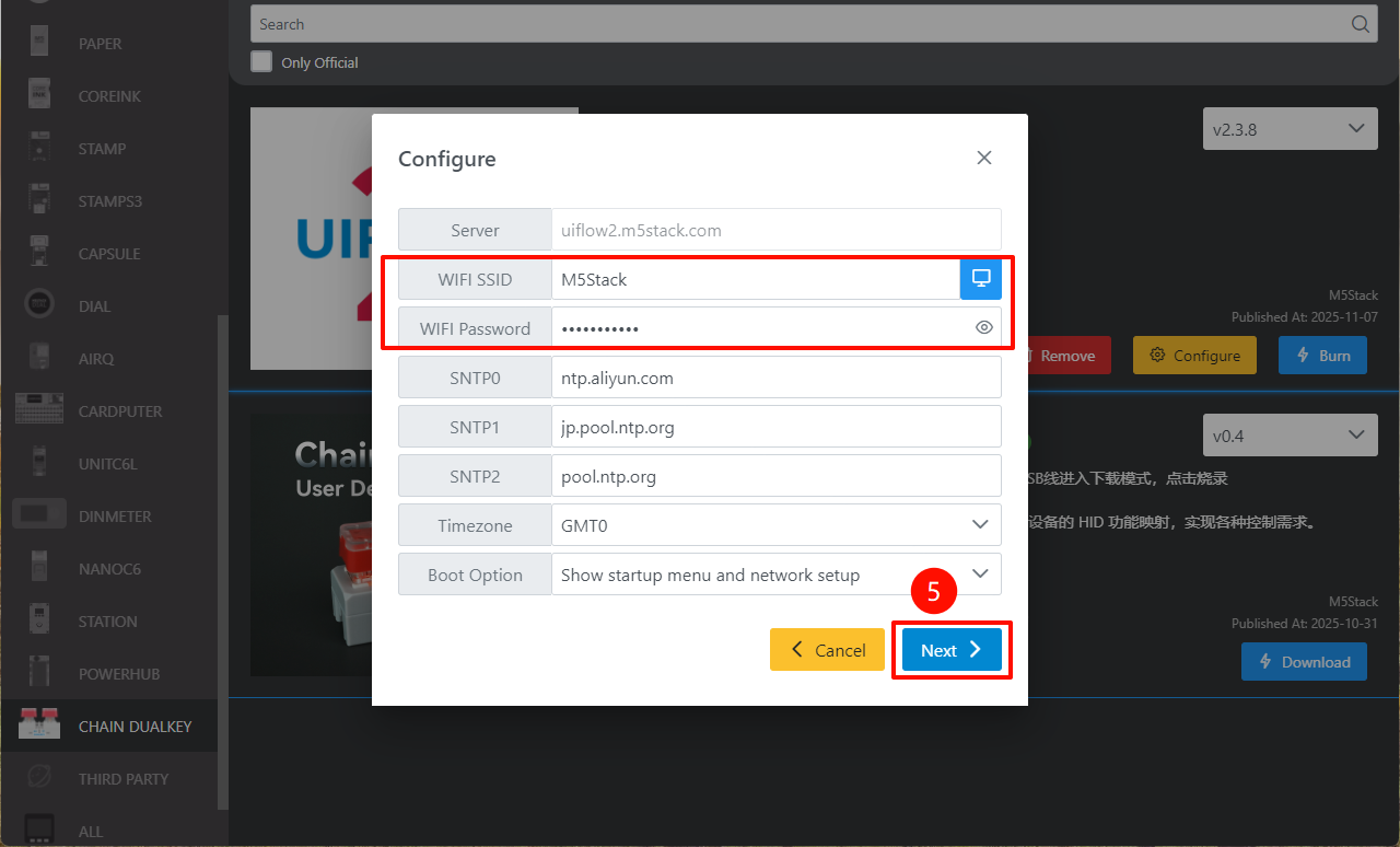 After completing firmware burning, if you need to modify the device configuration, keep the USB connection, restart the device, use M5Burner and click the Configure option. In the configuration interface that pops up, make modifications and click Next to update the configuration information.