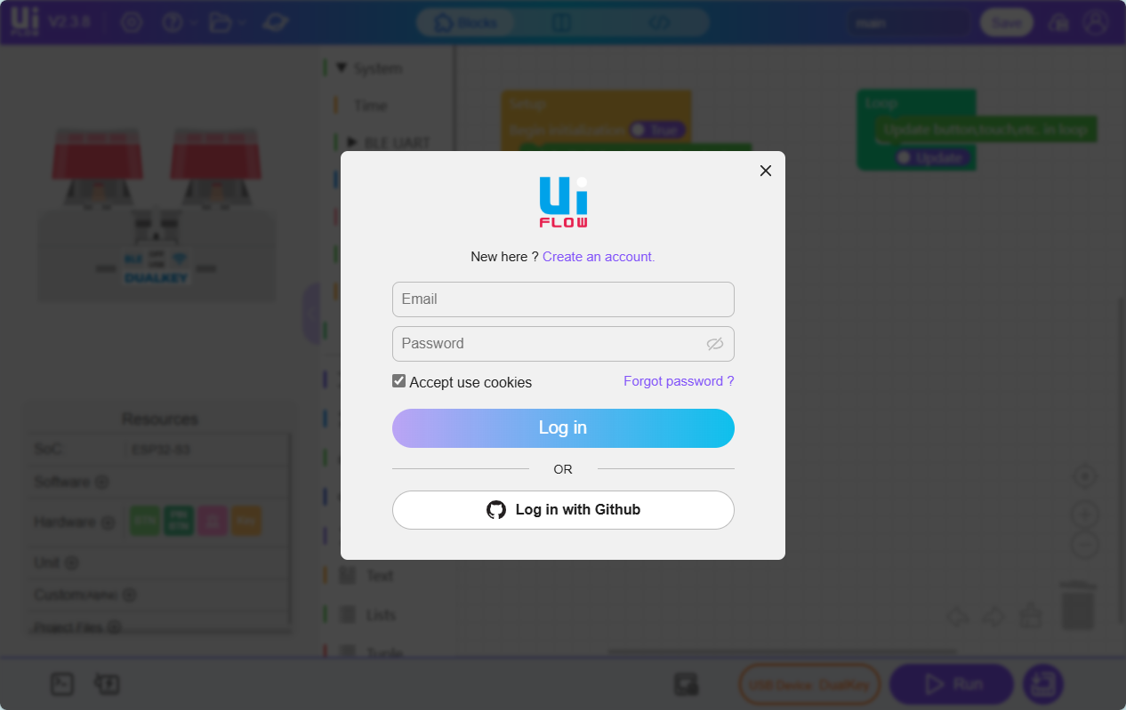 Go to UiFlow2 and click the user icon in the upper right corner to log in to your UiFlow2 system account.