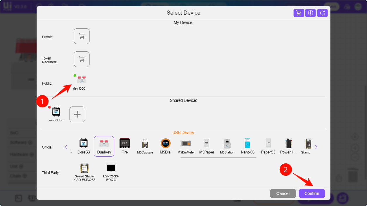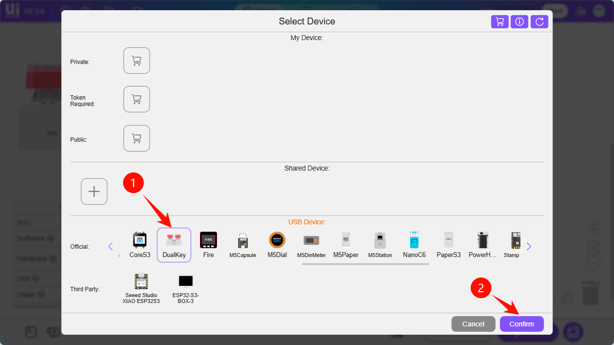 Connect Chain DualKey to your computer via a USB cable, select the Chain DualKey module in the device list, then click Confirm.