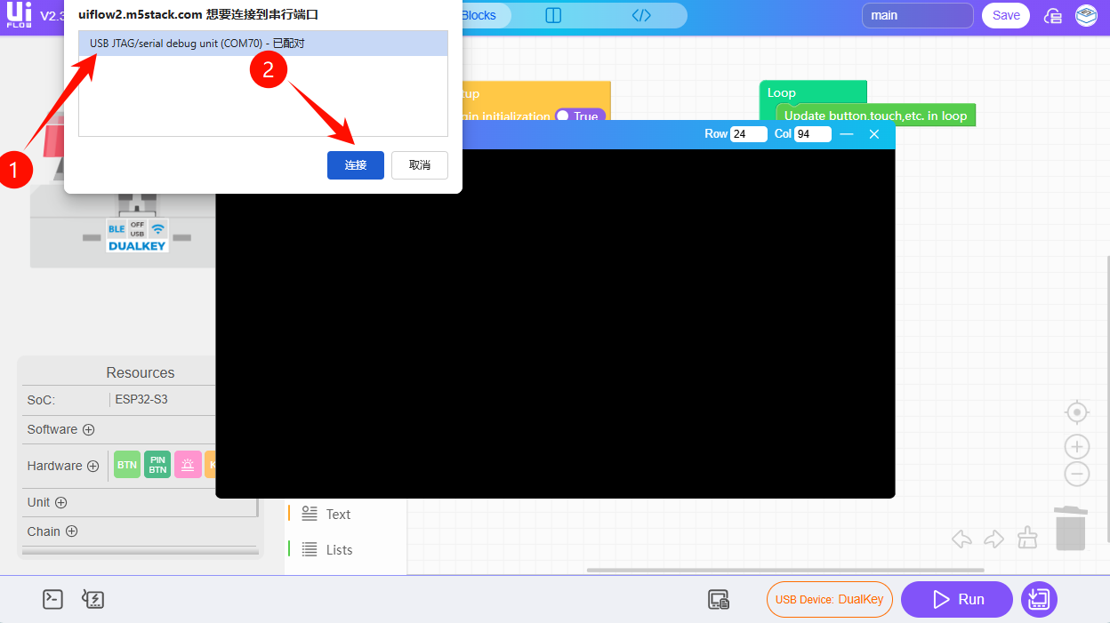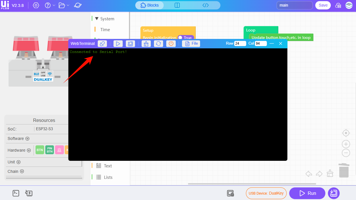 When the WebTerminal screen shows Connected to Serial Port!, it indicates that the USB connection is successful and you have entered the UiFlow2 programming interface.