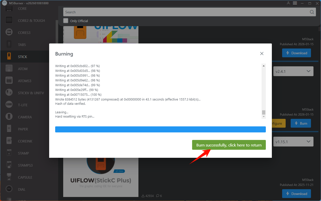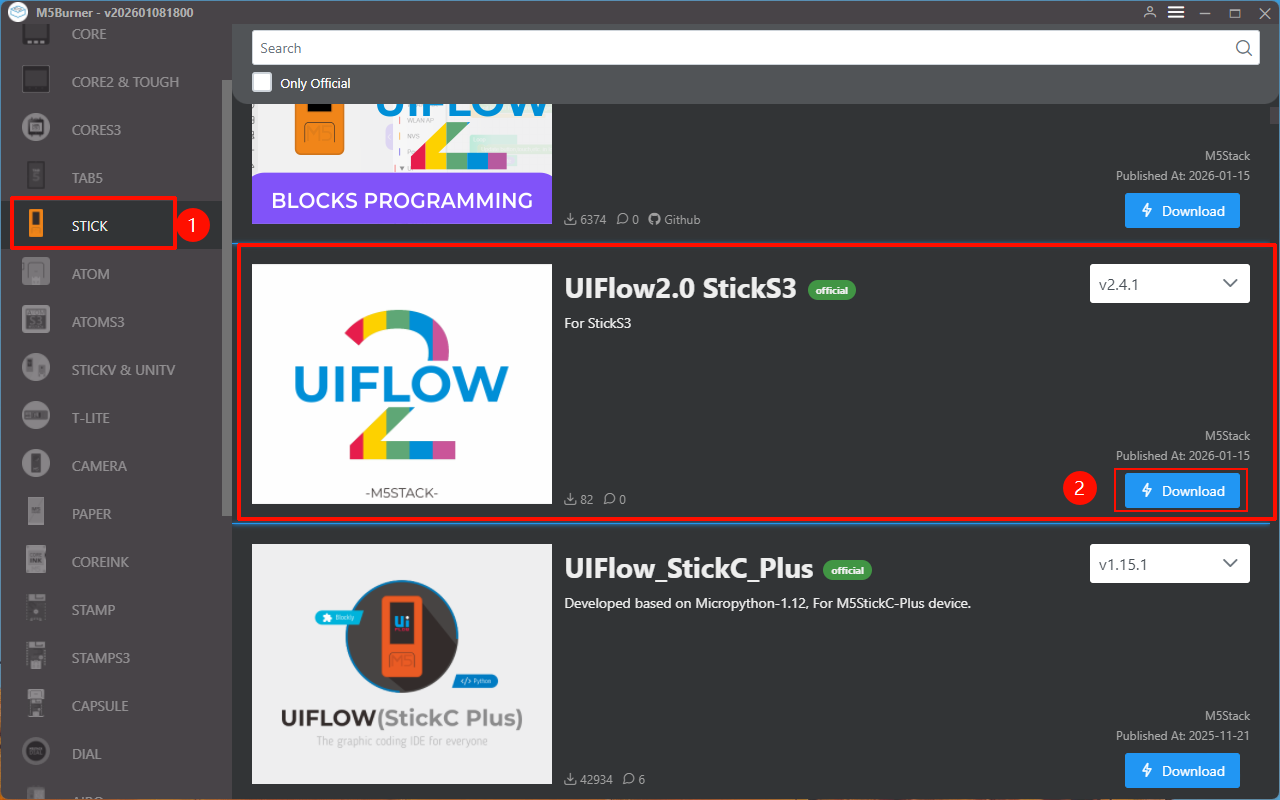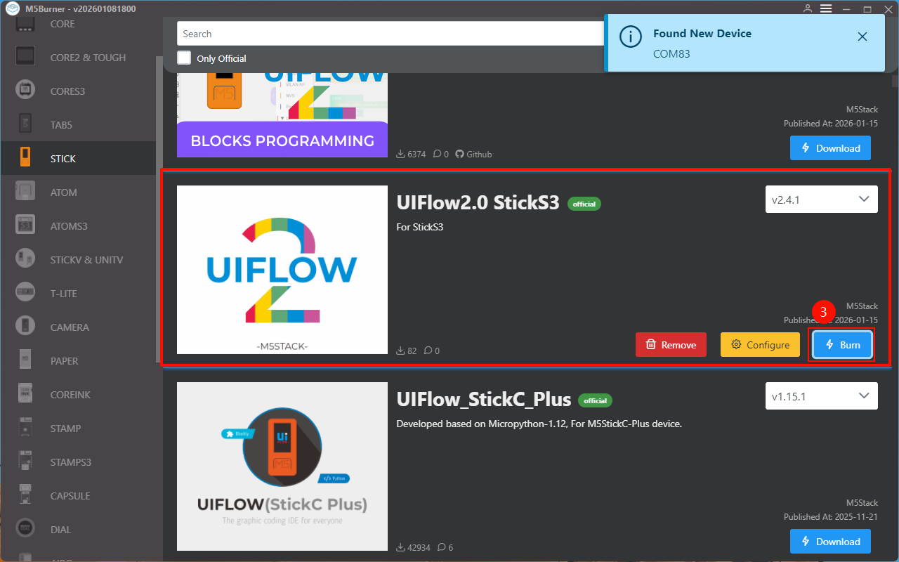 StickS3 in M5Burner, as shown in the figure below.
