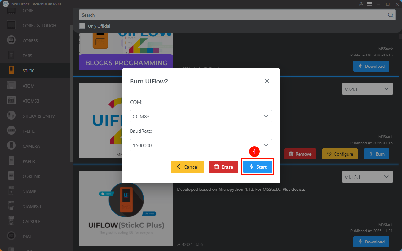 - Refer to the UIFlow2 Web IDE Tutorial to learn the basic workflow of using UiFlow2, and complete the installation of the M5Burner firmware burning tool.