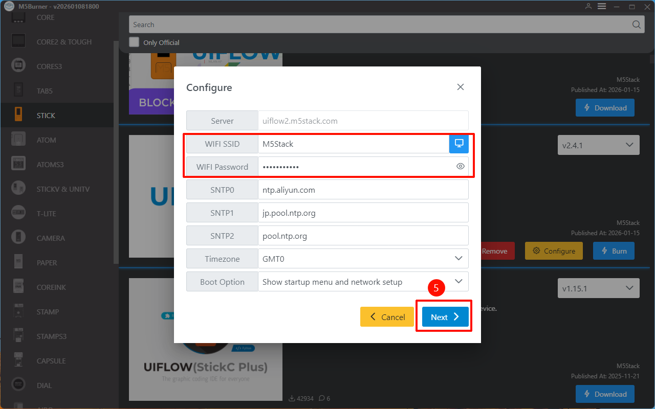 - Connect the device to the computer via a USB cable. In M5Burner, click the