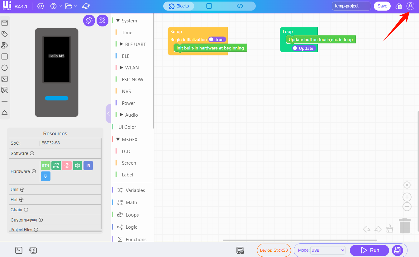Enter the UiFlow2 page and click the user icon in the upper right corner of the page to log in to your UiFlow2 system account.