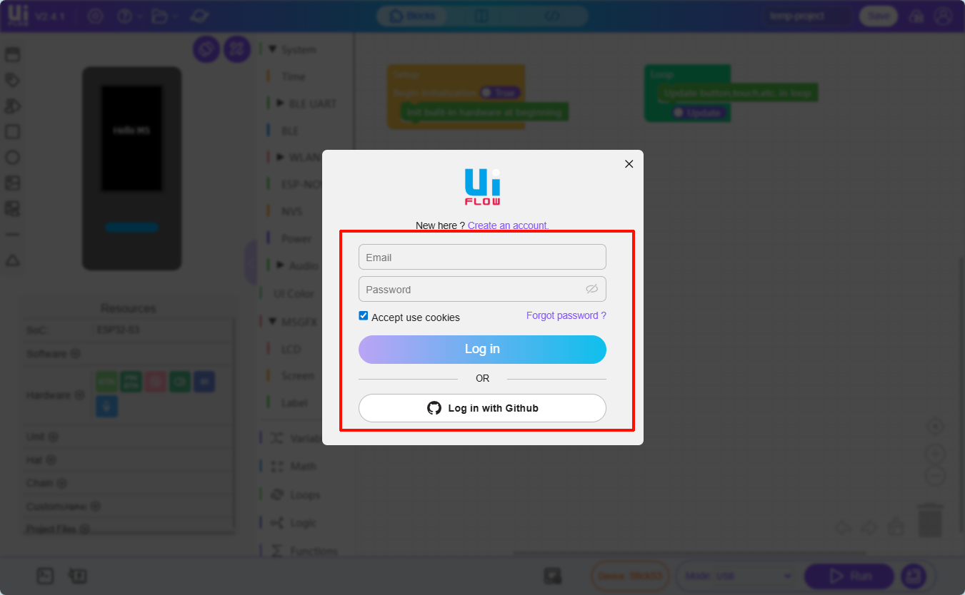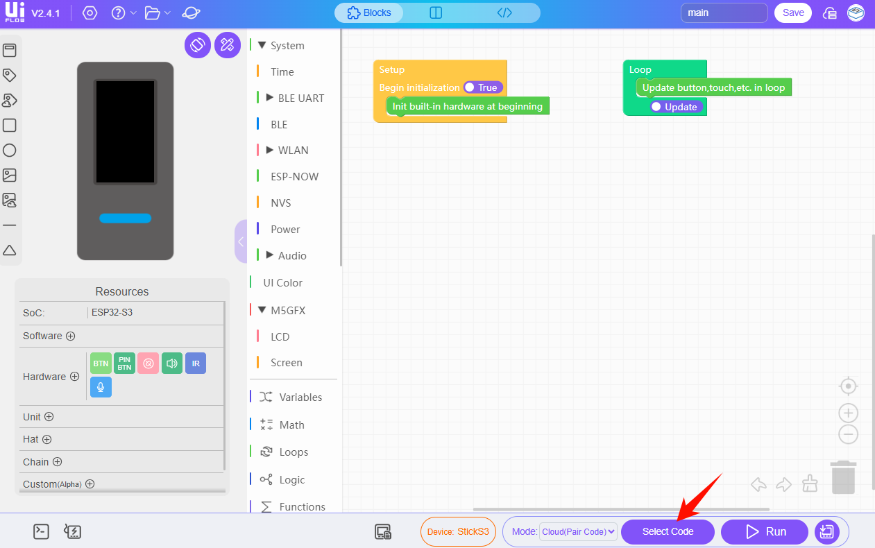 You can connect the device to UiFlow2 via USB or Pair Code to enter the programming page. The specific methods are as follows: