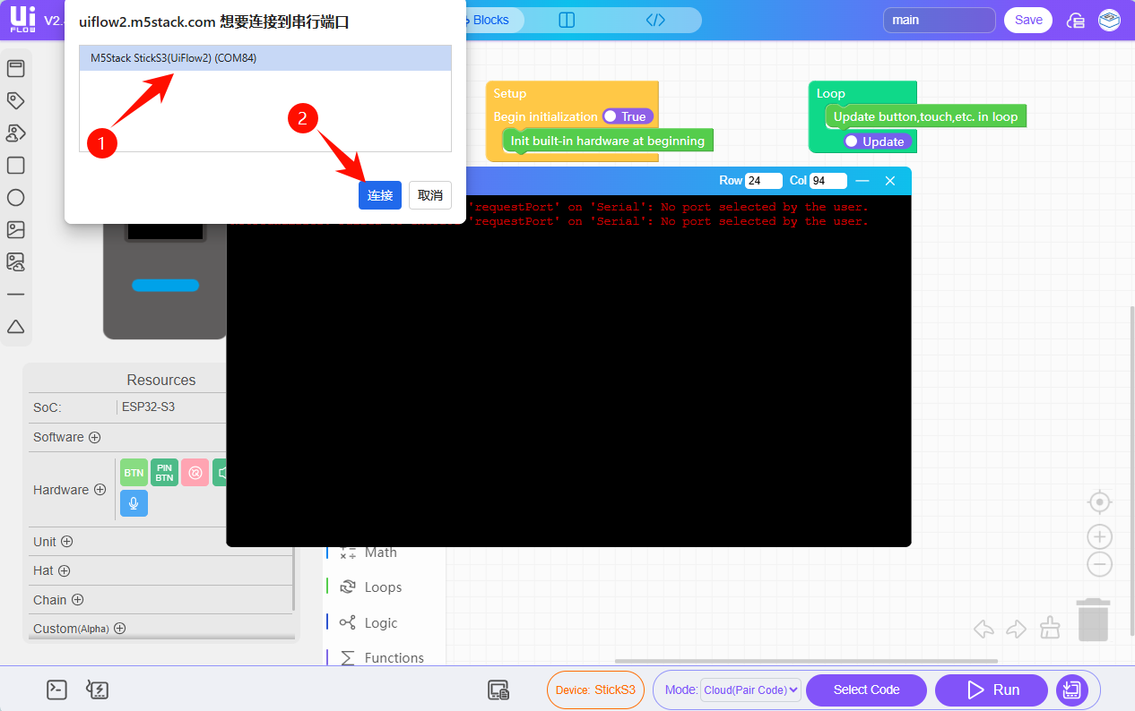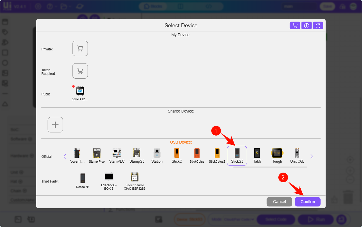 - Connect StickS3 to the computer via a USB cable. After selecting the StickS3 device module in the device list, click