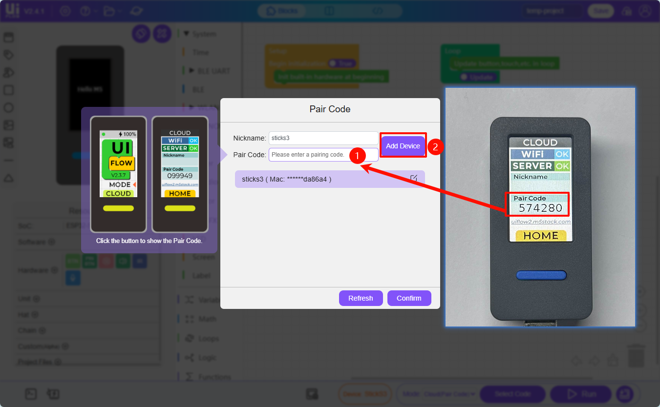 After entering the Pair Code, click Add Device to connect StickS3 to UiFlow2.