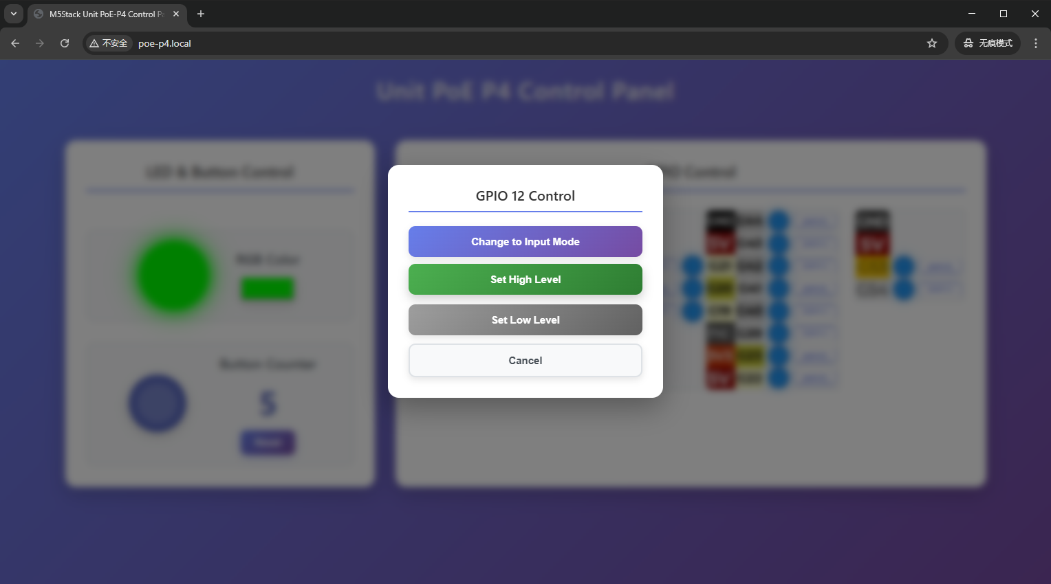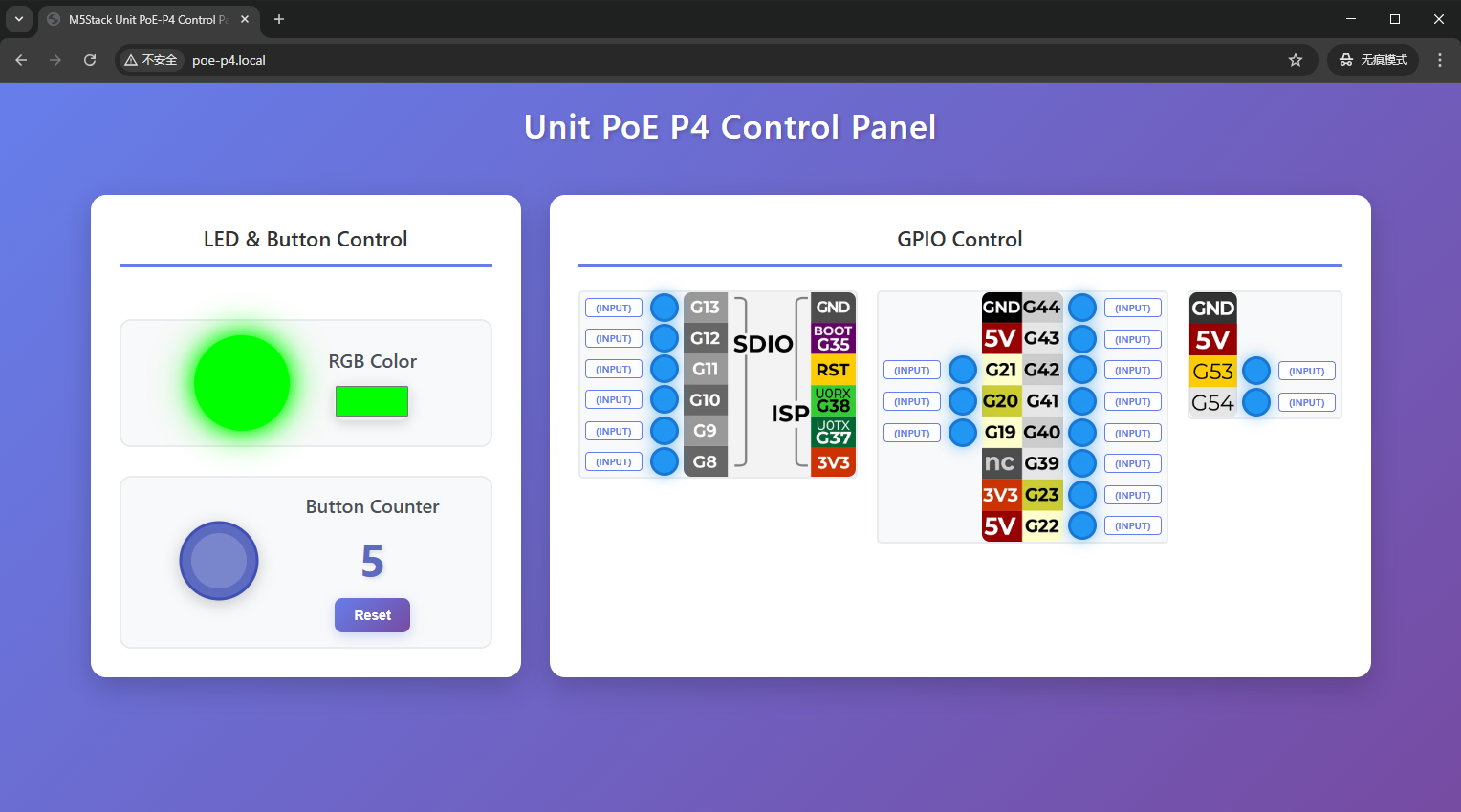 The factory default firmware of the device is preloaded with a WEB control panel, which supports RGB LED color control, button press count statistics, GPIO pin mode switching, and high/low level output. The device control page can be accessed by following these steps: