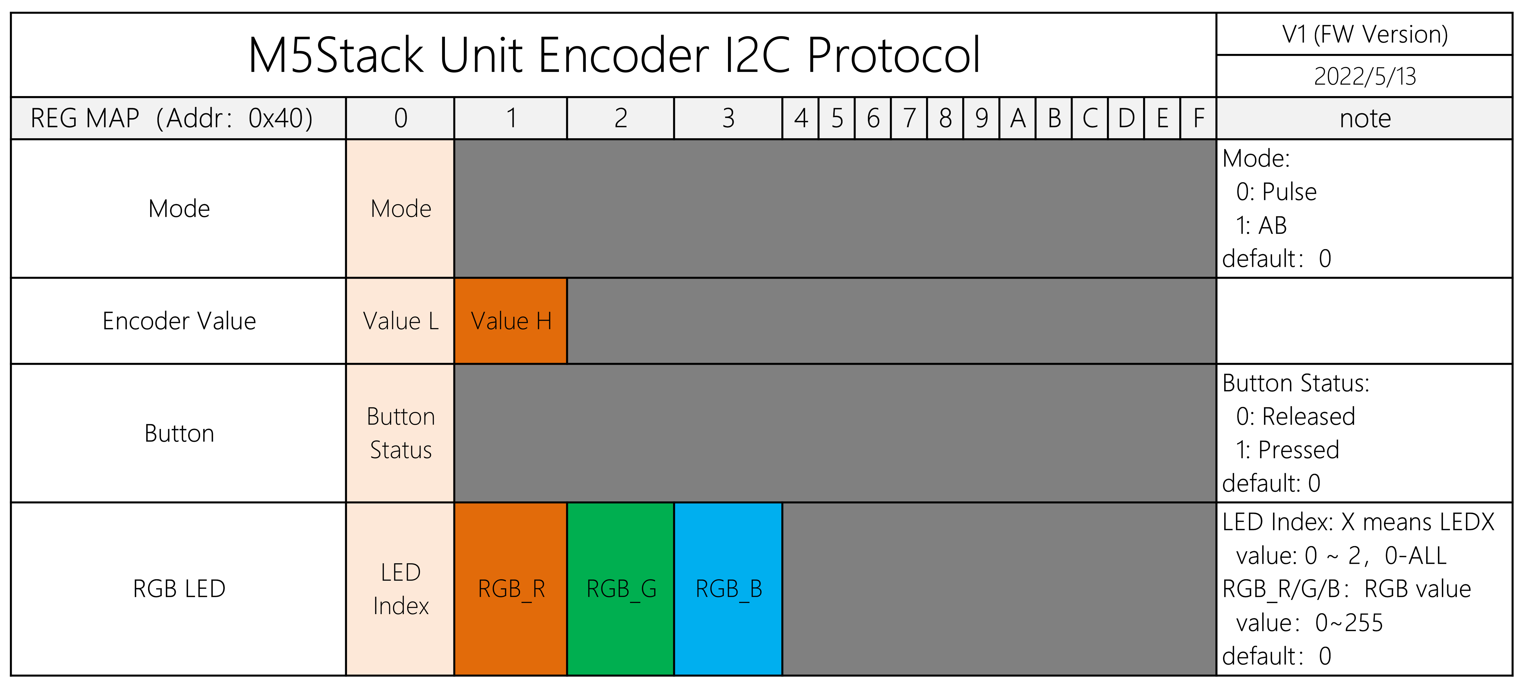 Unit Encoder is an I2C communication interface rotary encoder expansion unit. It integrates a 30-position pulse encoding knob (with button input) + 2x SK6812 programmable RGB LEDs. The built-in STM32F030 main control integrates encoder pulse signal acquisition firmware, allowing users to directly obtain the encoding value through I2C read operations, simplifying the process. It is suitable for scenarios such as scale value control/volume adjustment.