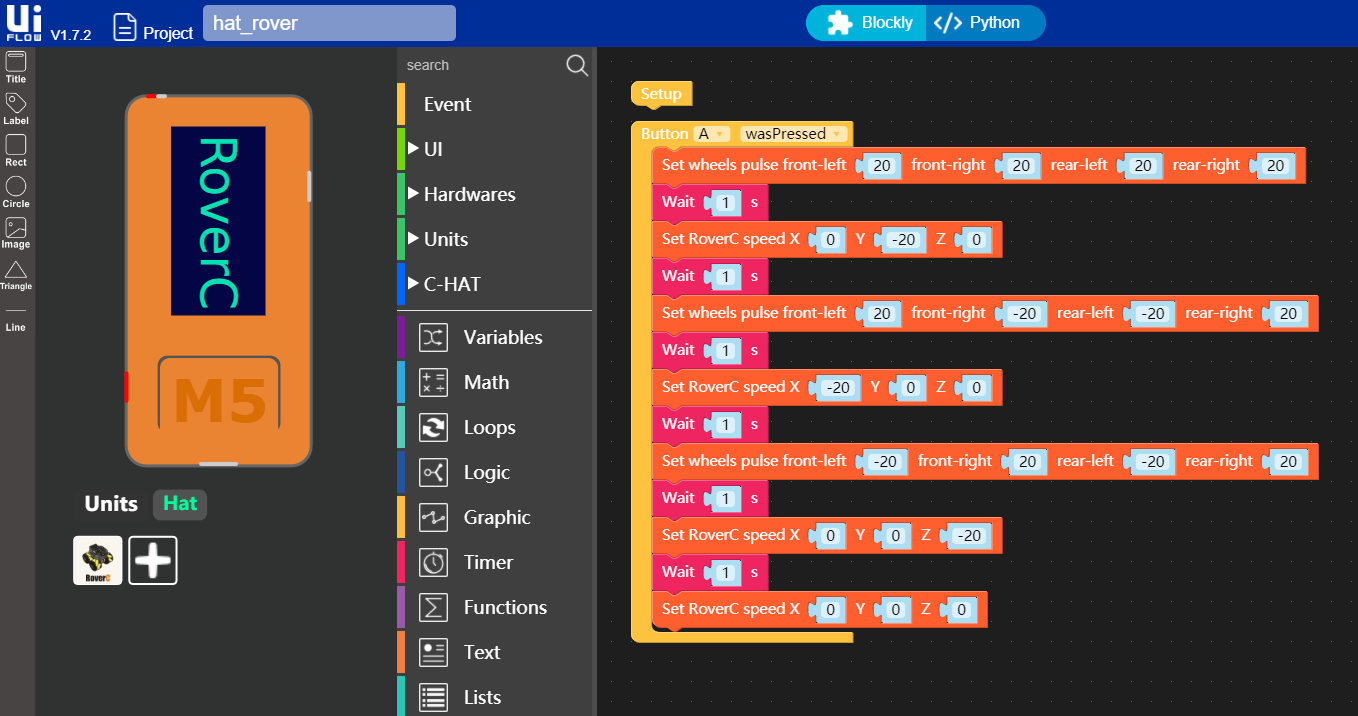 RoverCは、M5stickC に対応したプログラマブルな全方位移動型ロボットベースであり、M5stickC を挿入することで起動させることができます。ベースのメインコントローラは stm32f030f4 というマイクロコントローラです。ベースには N20 ウォームギアモータが搭載されており、4 チャンネルのモータドライバで直接駆動されます。これらのモータは全方向に移動可能なメカナムホイールに接続されています。さらに、他のモジュールの拡張を容易にするために、2 つのグローブ互換 I2C ポートが提供されています。また、ベースはレゴブロックに対応しており、構造を拡張することが可能です。ベース背面には 18350 バッテリーを搭載し、車のパワーと耐久性の要求に応え、独立したスイッチで制御することができます。