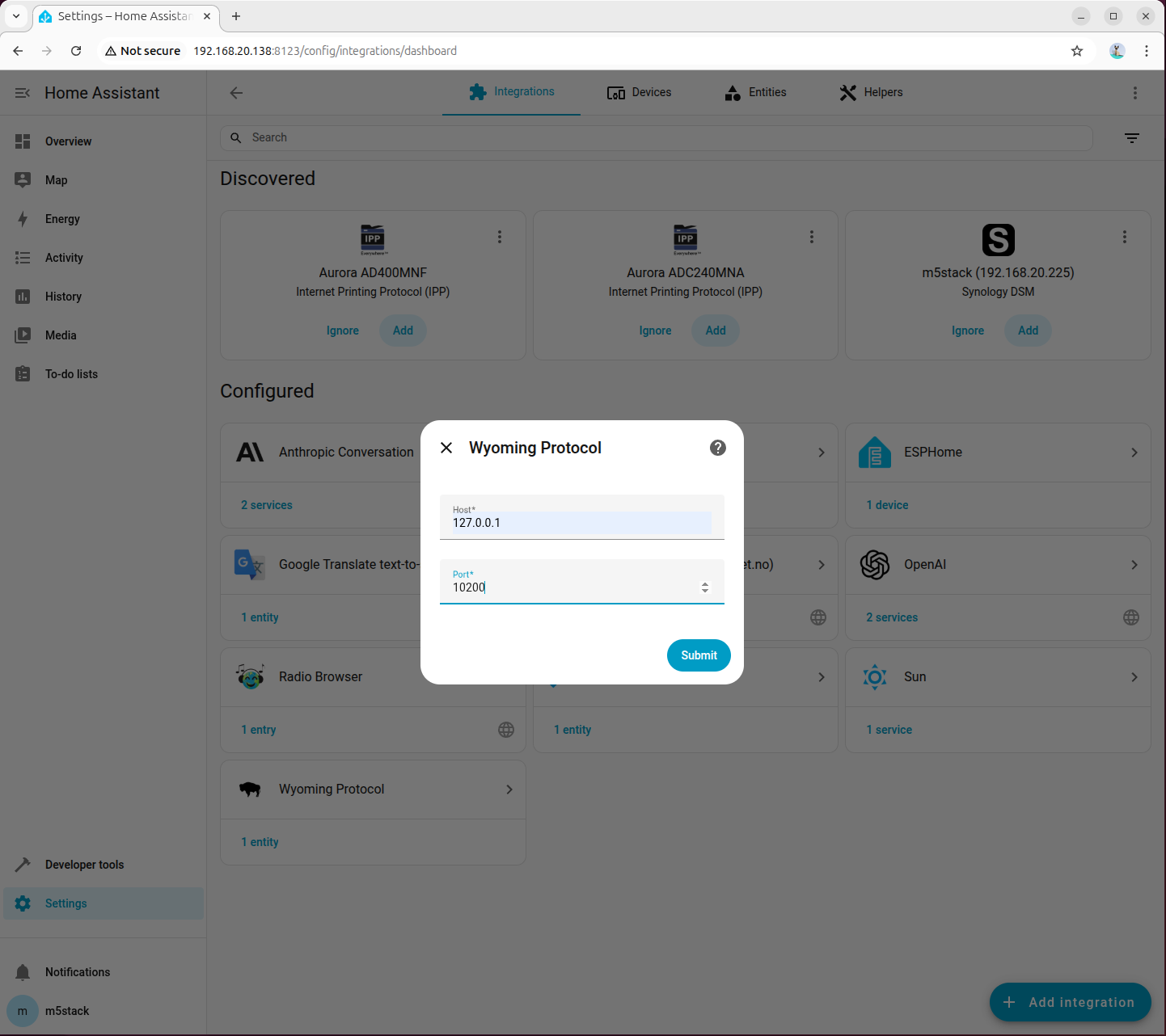 2026-02-04 17:03:19,082 - __main__ - INFO - Server started, waiting for connections... Home Assistant の設定を開き、「Wyoming Protocol」統合を検索して追加します: