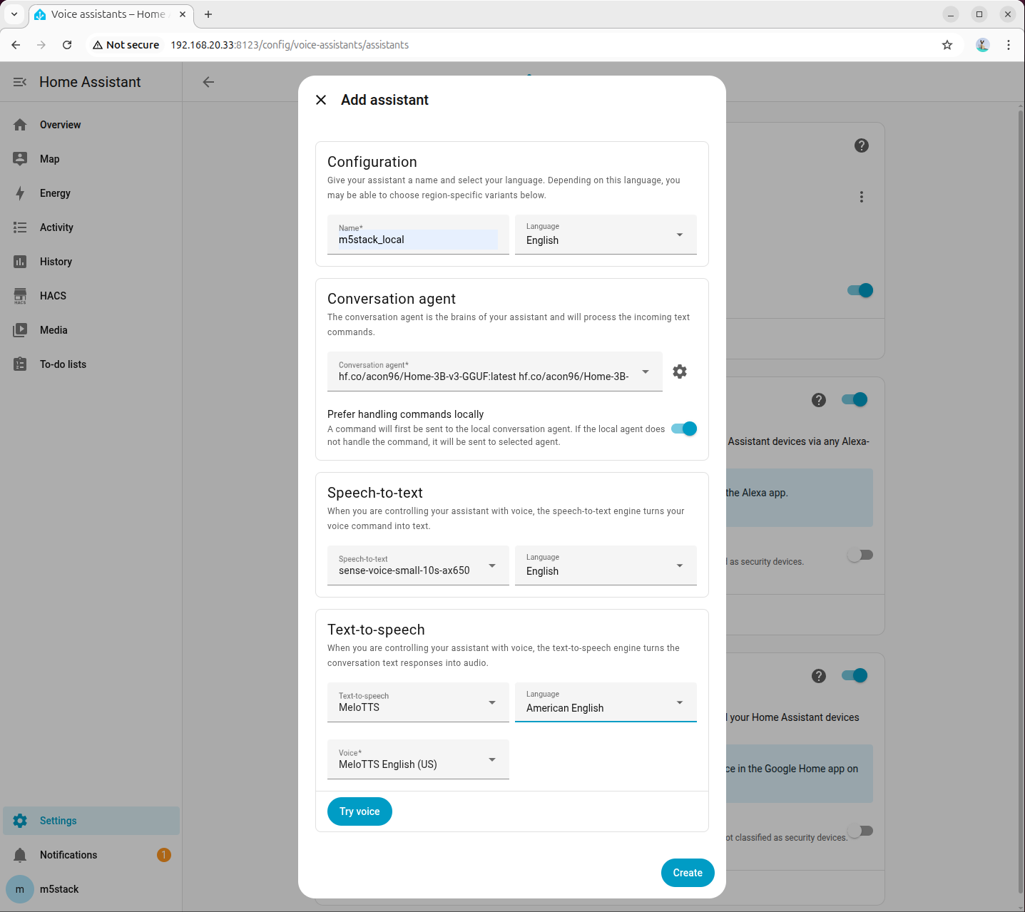 「設定 - 音声アシスタント」でアシスタントの設定を作成または編集します。テキスト音声合成(TTS)オプションを先ほど追加した「MeloTTS」に設定し、必要に応じて適切な言語と音声を選択します。対応する言語の TTS モデルがインストールされていることを確認してください。ここでは例として American English で説明します:
