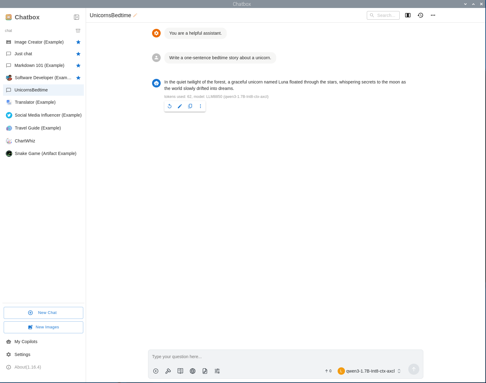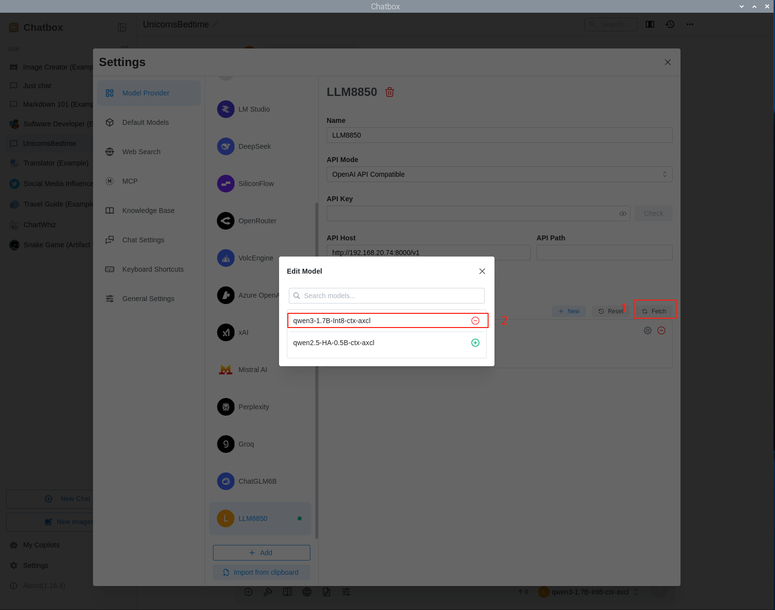 创建新聊天,选择 LLM8850 提供的 qwen3-1.7B-Int8-ctx-axcl 模型