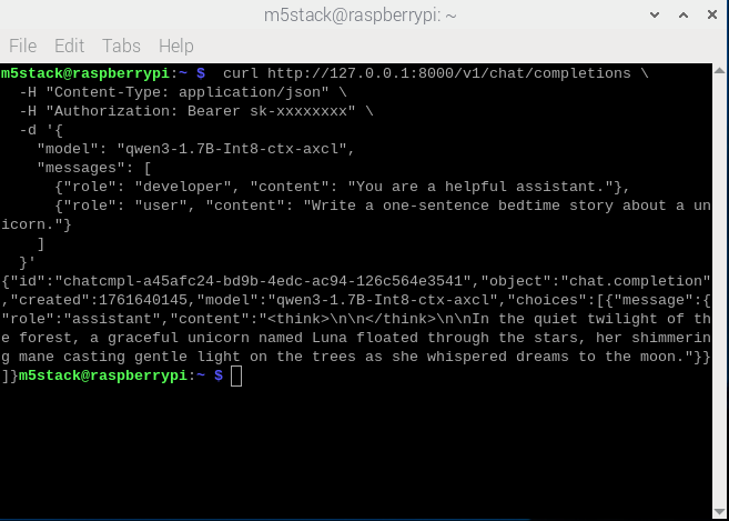sudo apt install lib-llm llm-sys llm-llm llm-openai-api sudo apt install llm-model-qwen3-1.7b-int8-ctx-axcl curl http://127.0.0.1:8000/v1/models \