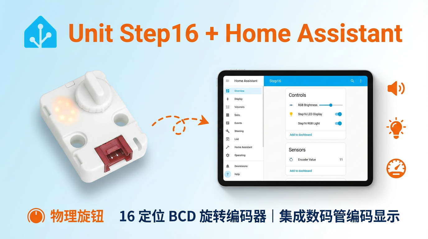 本教程将介绍如何使用 Unit Step16 16 位旋转编码器控制单元集成至 Home Assistant,实现旋钮数值与灯光控制。