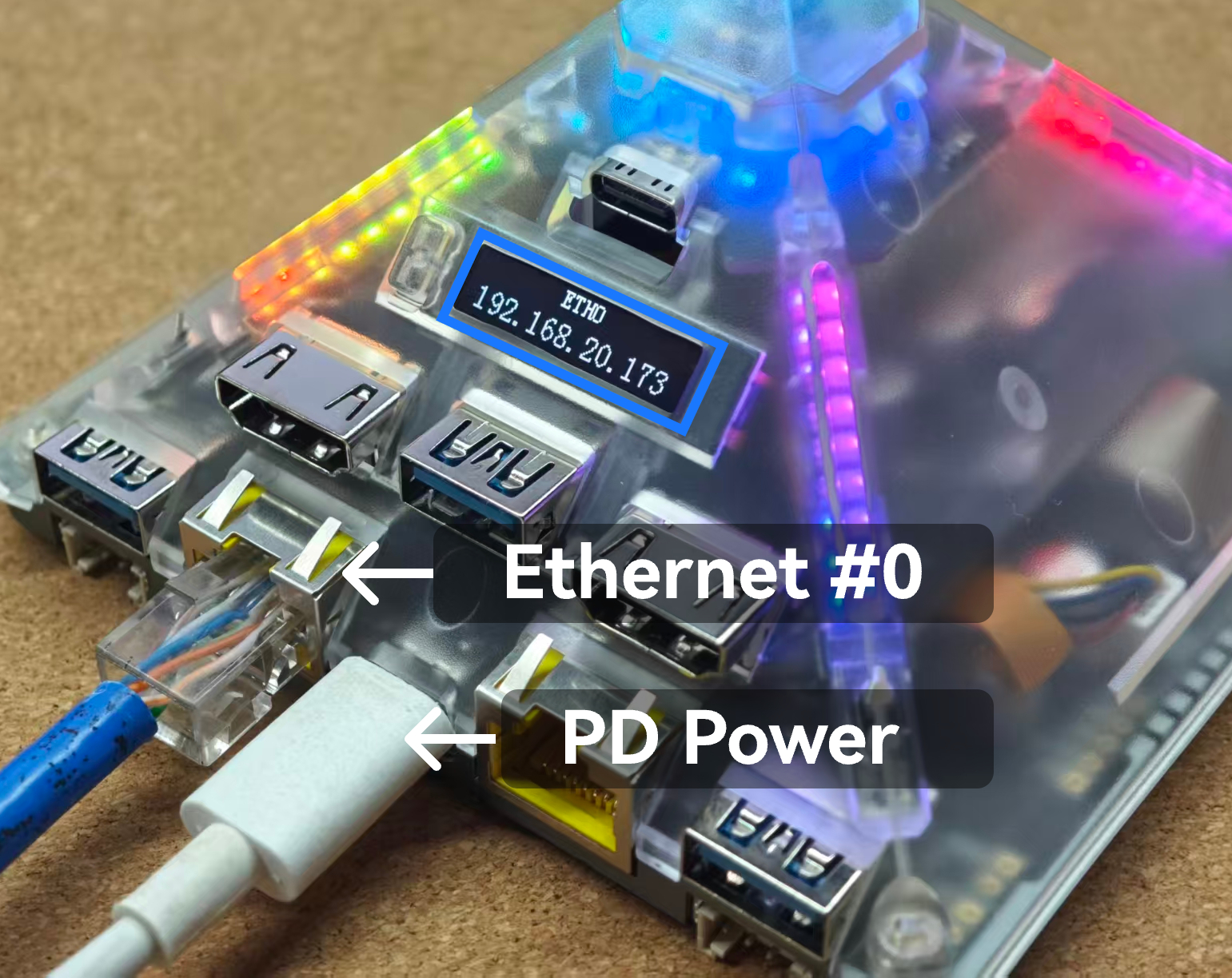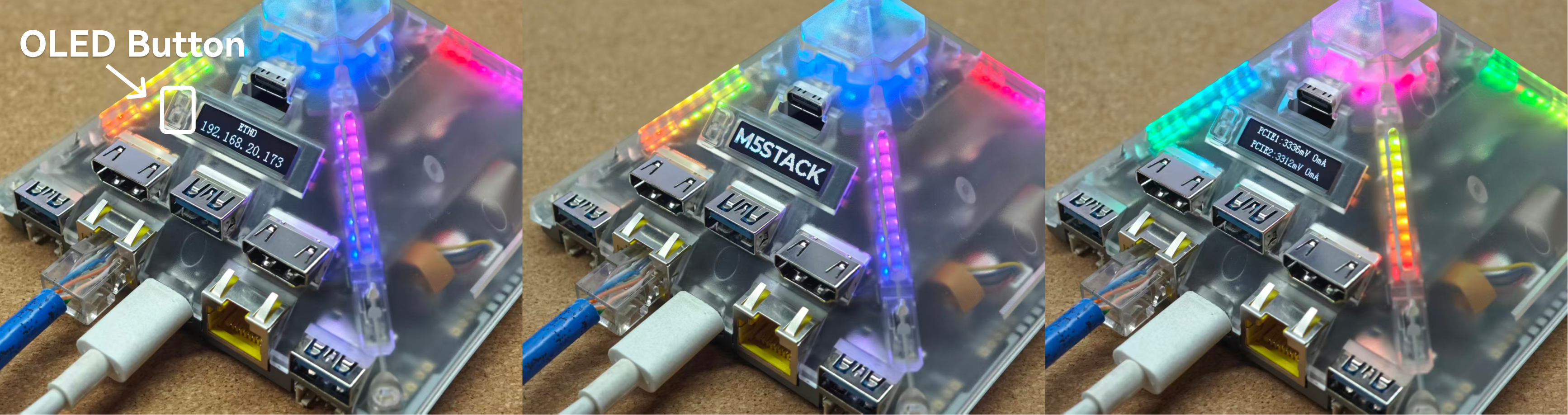 设备连接以太网,开机启动后,将通过 OLED 屏幕显示当前 IP 地址。