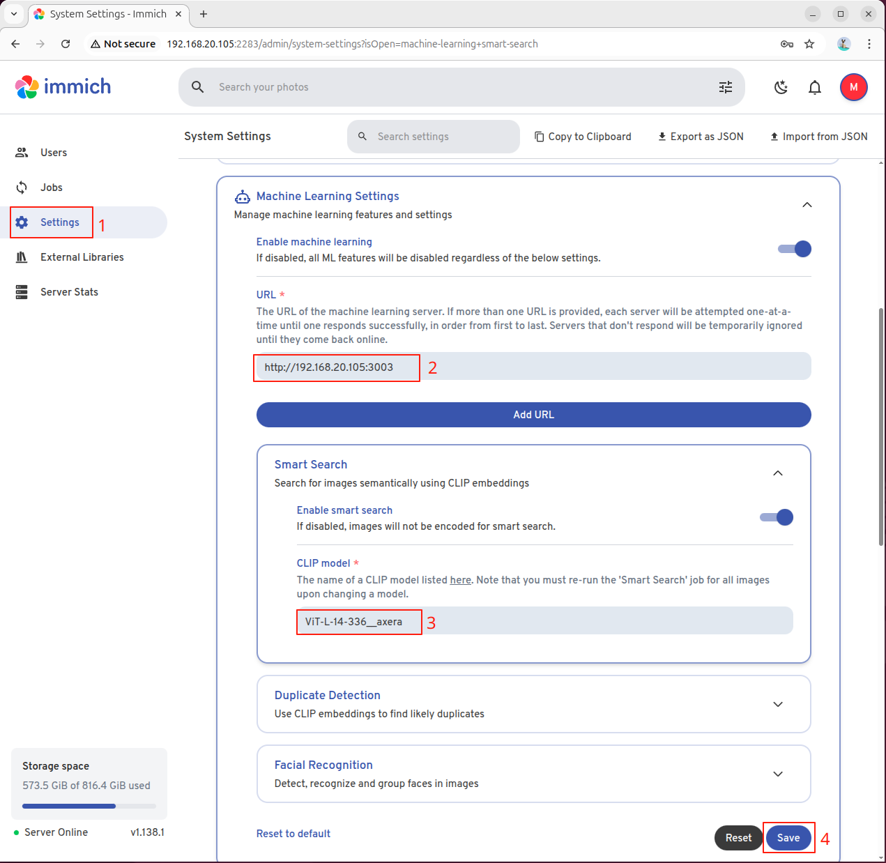 配置完成,即可上传照片和视频,第一次需要配置机器学习服务器,参考下图进入配置